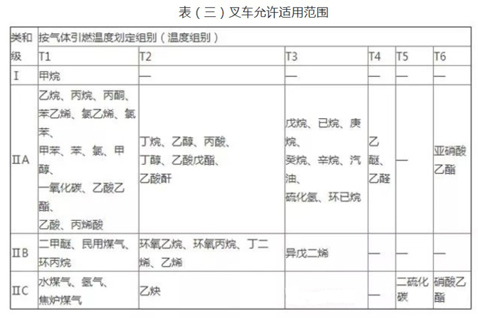 對(duì)于I、II區(qū)爆炸性氣體環(huán)境表(三)為叉車允許適用范圍,表(四)為危險(xiǎn)區(qū)域的溫度組別劃分。