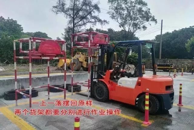 作業(yè):乙?guī)斓呢浖埽ǜ叩哪莻€)入叉叉貨以后倒車直接升到頂(油缸提升的時候要加油提速,不要怠速提升),放下后稍微停一下,馬上又提升放回下層,然后倒車入丁庫,入庫時只要求整車身入庫,入庫后,貨叉要放到地,不然要扣分。丙庫的貨架一樣的操作,貨架放地上以后,倒車回甲庫起點,貨叉也要入庫,謹記貨叉要后傾并提升至離地20-40cm。