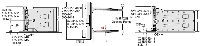 | Capacity 承載能力(kg) | Catalog Order NO 型號(hào) | Mounting Class 安裝等級(jí) | Opening Range張臂范圍(mm) | Rad Height夾板高度A(mm) | Arm Length臂長(zhǎng)B(mm) | Arm Thickness臂厚C(見注5)(mm) | Arm Toe in內(nèi)扣量AT(見注6)(mm) | Vertcial Center Of Gravity垂直重心CGV(mm) | Weight 自重(kg) | Effective 失載距ET(mm) | Horizontal Center of Gravity 水平重心CGH(mm) |
