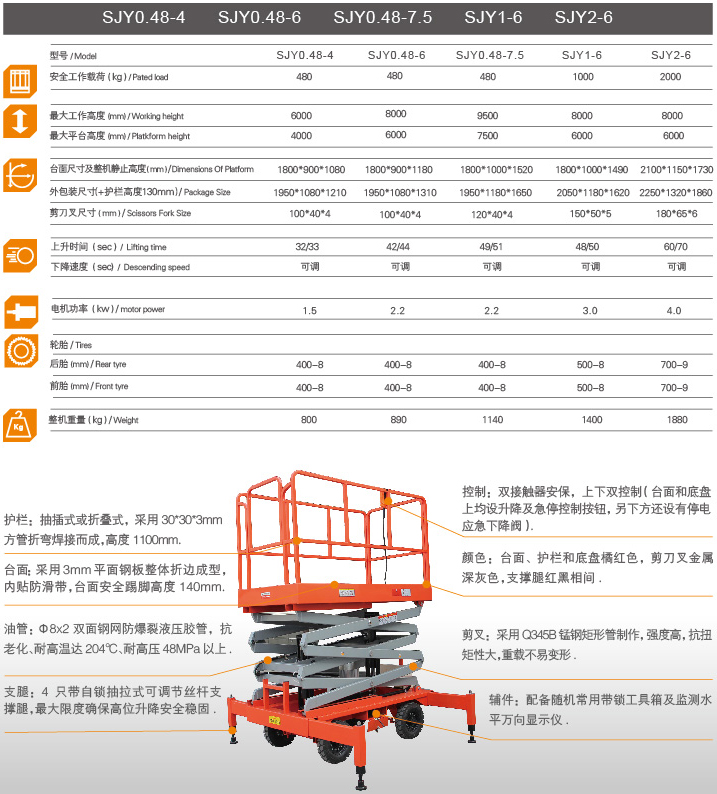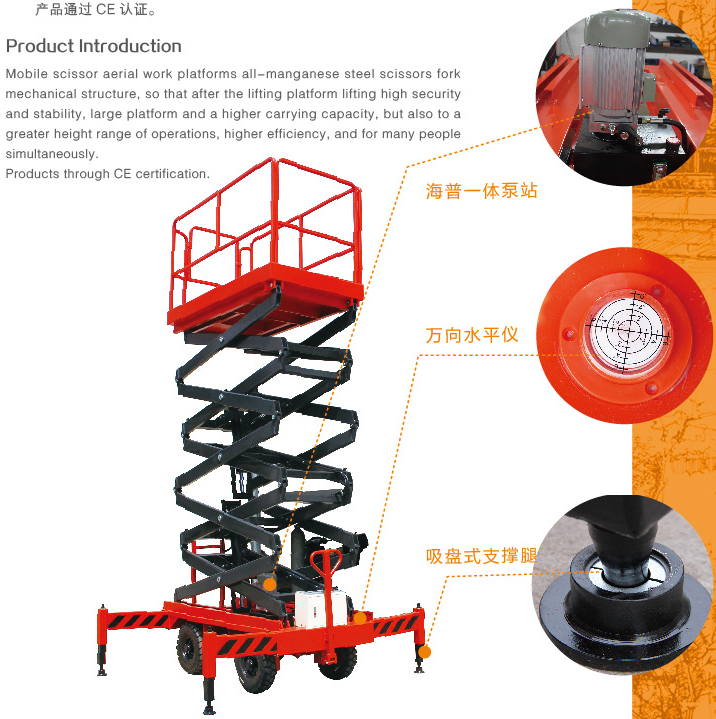 移動剪叉式高空作業(yè)平臺采用全錳鋼剪刀式機械結(jié)構(gòu),使升降臺起升后有很高的安全穩(wěn)定性,寬大的作業(yè)平臺和較高的承載能力,也使高空作業(yè)范圍更大,效率更高,并適合多人同時作業(yè)。